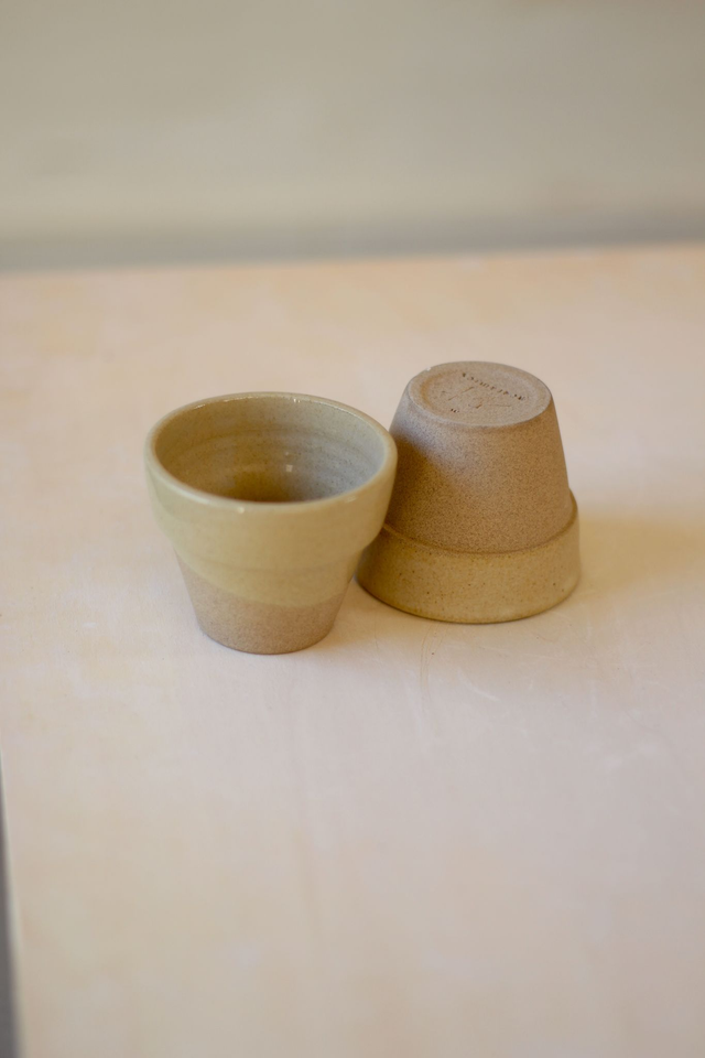 Taza diseñada específicamente para el café de especialidad, conserva medidas y proporciones óptimas. Torneada en gres grisáceo o beige y esmaltado con mezcla de tierras. Horneado a 1280 grados