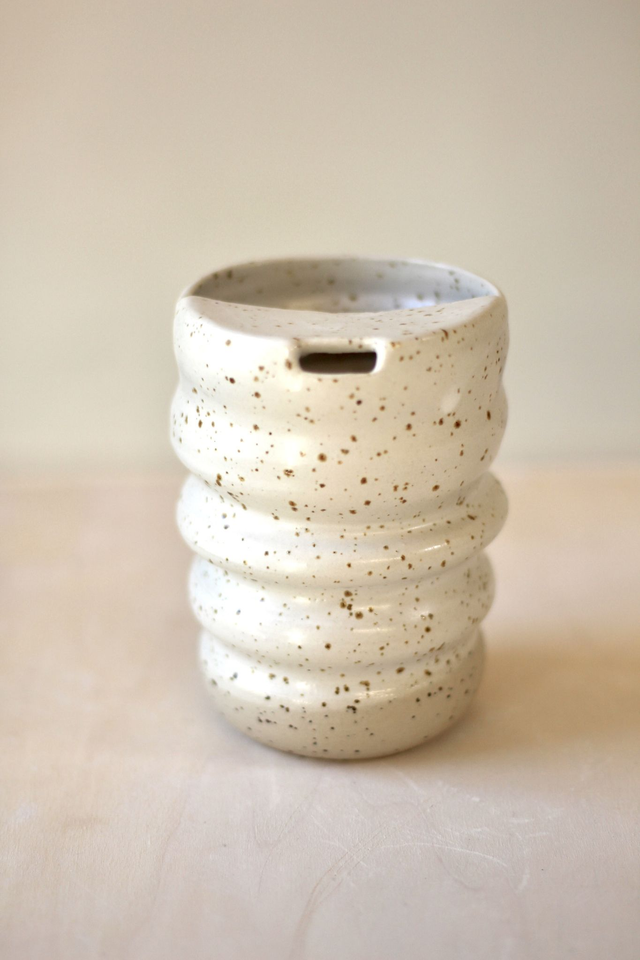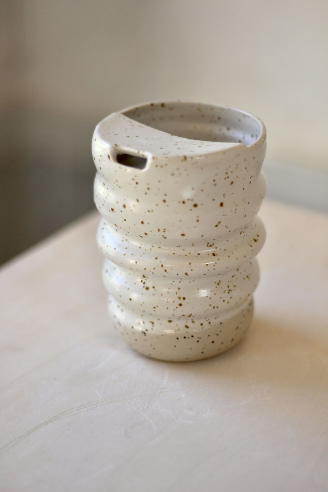 Taza para llevar torneada en gres moteado beige y esmaltada en blanco mate. Horneado a 1280 grados.