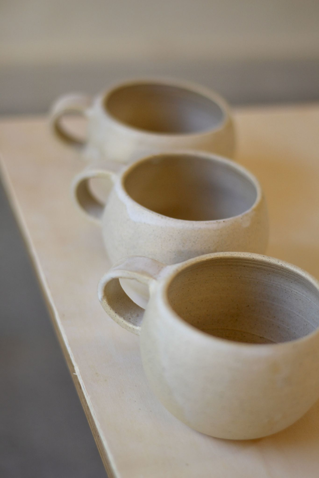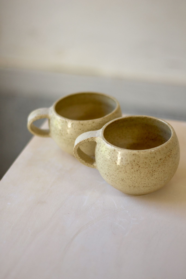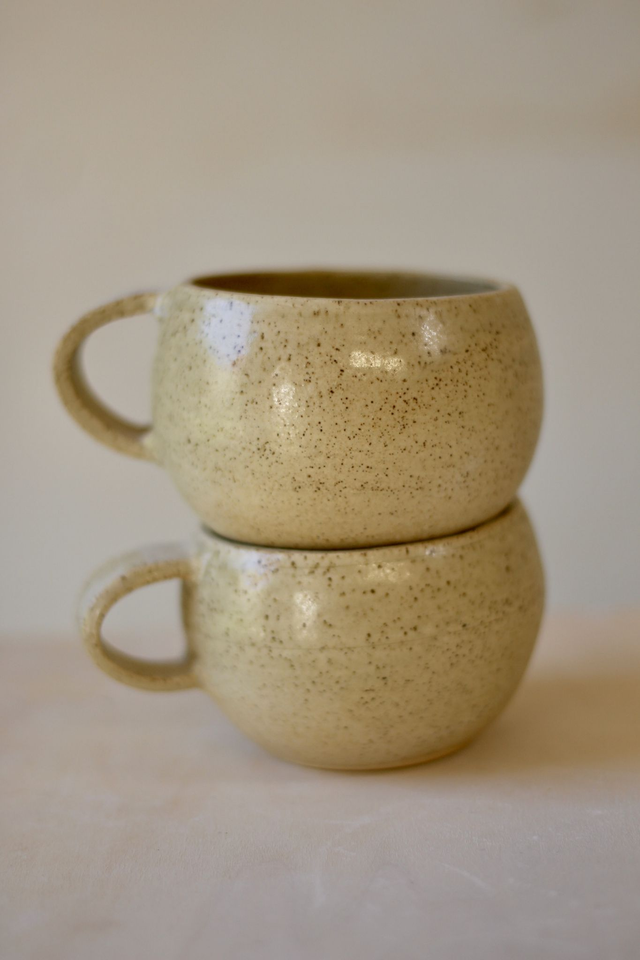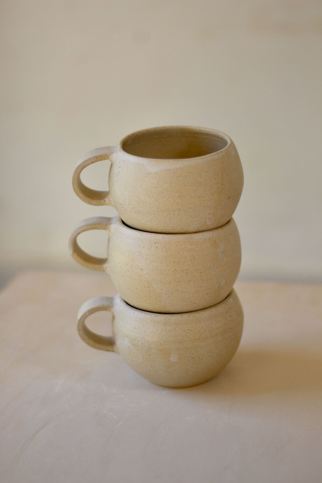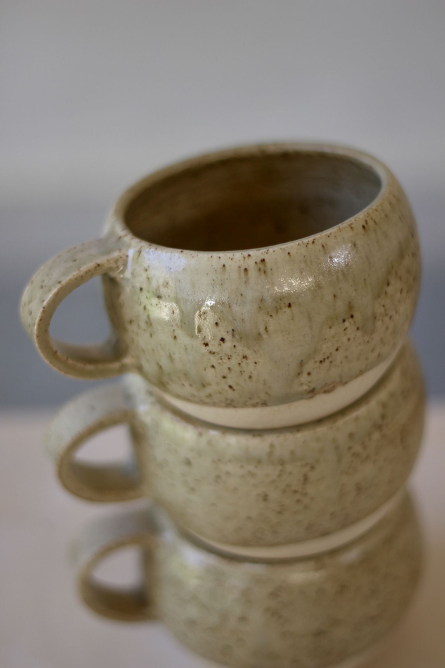 Taza torneada en gres beige y esmaltado con mezcla de tierras. Horneado a 1280 grados.